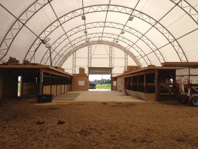 In order to keep riding year round and provide the animals with a warm environment that is protected from the elements, Taylor began researching structure options. She says, “We heard about ClearSpan through FarmTek, their affiliate company. We bought a small hoop barn from them a few years ago and were very happy with it. We chose a Hercules Truss Arch Building because there are endless possibilities for it. It is so bright and open. Also, we liked the height for hay storage and clearance in the indoor arena. In the indoor, I wanted a lot of height so that if we get a boarder who ropes, they would have room to do so. It is also great to have the loft above the stalls.”