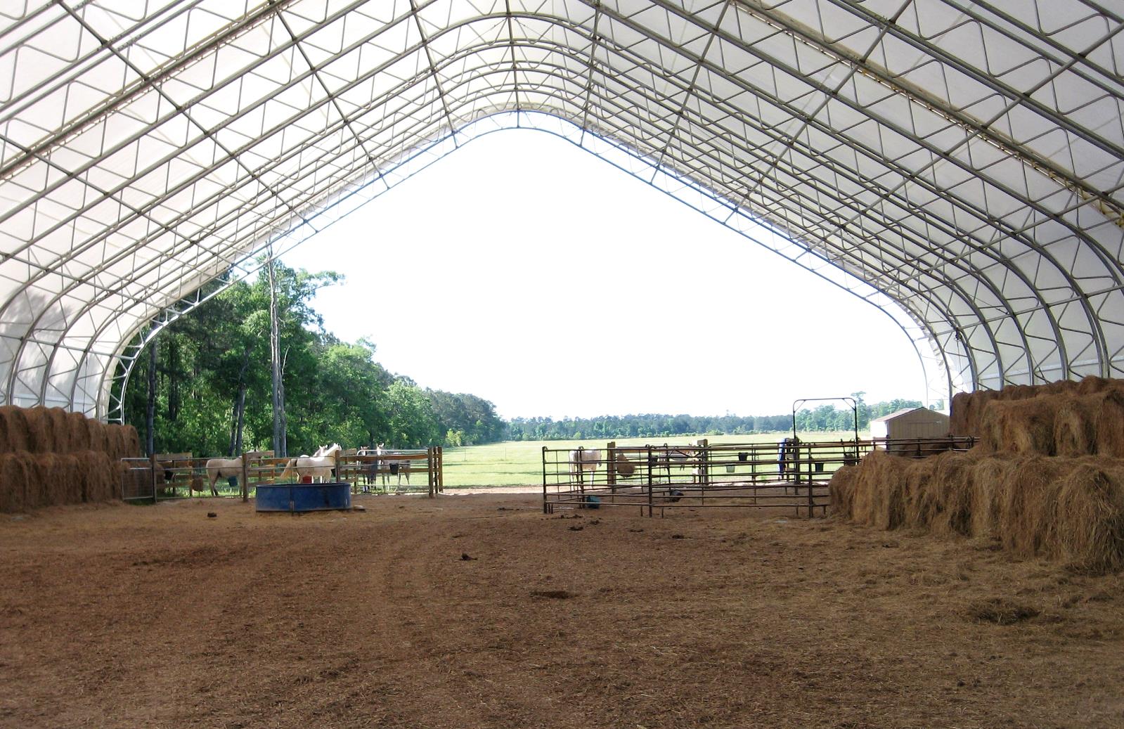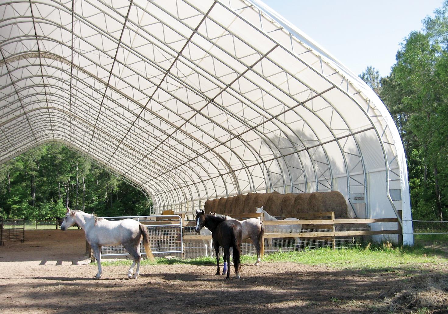 To work around the summer heat, they purchased a ClearSpan Hercules Truss Arch Building. “It was the only possible way that we could have afforded this size building,” says John. At the time, they had four horses that they had rescued from neglectful owners. He explains, “We had to buy them off people who had abused them, mostly through neglect and/or ignorance. Since coming here and getting the place together, we made contact with Habitat for Horses and offered ourselves as a foster home.”