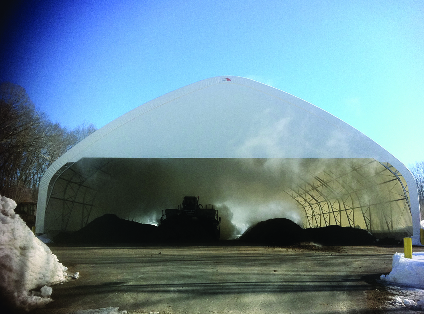 UConn’s goals for its covered compost facility included reducing and eventually eliminating the practices of stockpiling and land applying manure, decreasing farm-waste volume, providing research, education and outreach opportunities for CANR and UConn’s extension program, and adding the ability to compost campus leaves and landscaping waste. As a result, the university installed an 83′ wide by 120′ long Hercules Truss Arch Building from ClearSpan Fabric Structures. “We chose a fabric structure because of the affordable cost and ability for expansion,” explained Ferri. “Although we constructed a 10,000 square-foot facility, our site was designed to include a second structure in the future. The ClearSpan structure is very adaptable and will make expansion easy. The facility can grow as our needs grow.”